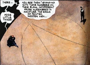 Simmetricamente, l’opera è affiancata da quest’altra scultura dall’aspetto decisamente cyberpunk, dove un uomo con la testa sostituita da un monitor televisivo e un corpo risultante dall’assemblaggio di componenti tecnologici si erge spavaldo, simbolo della nuova era tecrocratica: l’unica figura a non apparire oppressa dalla postura, ma forse perché, appunto, lo schermo ha sostituito il cervello. Non a caso, è l’unica con cui l’artista non si identifica: non è infatti un autoritratto.