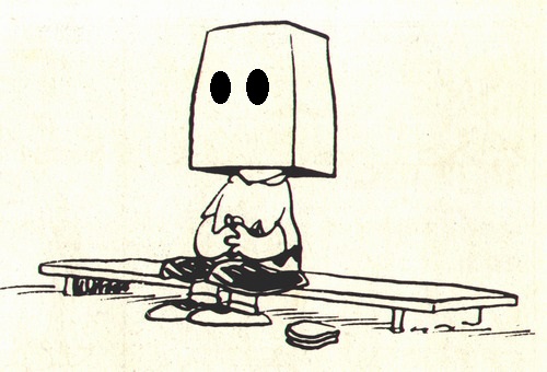 Tuttavia, il cappuccio è in realtà un sacchetto di carta, cosa che a me fa pensare subito ad uno dei più celebri cicli dei Peanuts degli anni ’70, quello in cui il protagonista si copre la testa con un sacchetto per mascherare un misterioso eritema a forma di palla da baseball (la sua grande ossessione). La singolarità lo porta a un grande successo, fino ad essere eletto il presidente del campeggio, per poi ovviamente fallire non appena guarito, e privo ormai della sua affascinante misteriosità.