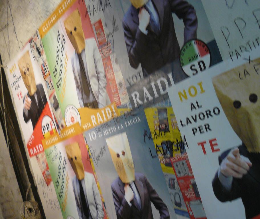 Al manifesto si collega anche la prima installazione che colpisce lo spettatore entrato nella mostra: un falso pannello di manifesti elettorali dove i volti di politici immaginari appaiono coperti dal medesimo sacchetto di carta.