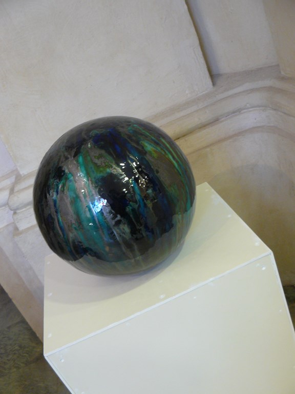 Indubbiamente comunque le opere di Nes Lerpa hanno una vitalità tumultuosa e prorompente, una luce che contiene al suo interno anche sprazzi di tenebra. Per questo, forse, l’opera più interessante mi è apparsa, in controcanto, questa sfera nera, minimale, cupa come la scura sfera di un veggente da rolegame fantasy. Lo Yin che c’è sempre nello Yang, o viceversa.