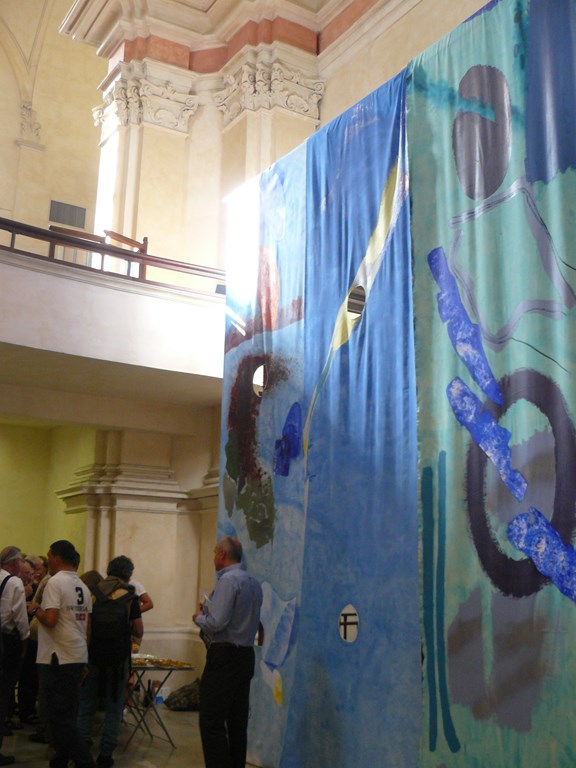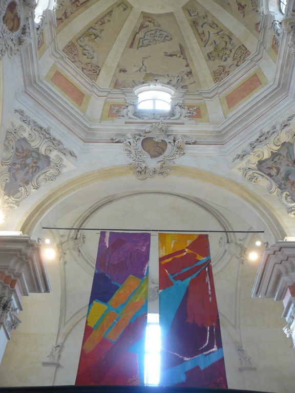 L’impatto di tutto questo gran pavese è ancora più eclatante sullo sfondo delle delicate, chiare scenografie rococò della chiesa, in un gioco di contrasto che esalta entrambe, la cornice e l’opera.
