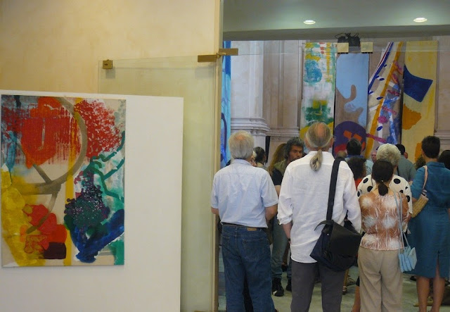 Le opere sembrano voler entrare in sinergia con l’ambiente, specialmente tramite due vessilli che colano sul pavimento in un profluvio di colori, come salse di uno dei ciclopici panini di Oldenburg.