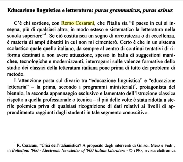 La stessa utilità la ebbe il suo volume nei quattro anni di università, a lettere: ho preparato le due Letterature, fondamento del mio indirizzo, su quei volumi. Il barone del mio corso, mio quasi-omonimo, interrogava “ad apertura di libro” e molti così cercavano la letteratura di riferimento più breve (il Cesarani era la più lunga).