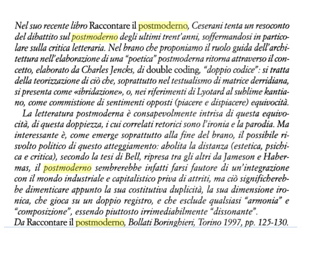 Ceserani infatti studia anche con grande attenzione il Postmoderno, in un saggio del 1997, di grandissima lucidità. Della “matrice derridiana” del postmoderno parla oggi anche meritoriamente Roberto Recchioni quando scrive una prefazione per il Dylan Dog del trentennale, per dire, ma chi ha introdotto autorevolmente questo concetto negli studi letterari italiani è soprattutto Ceserani.