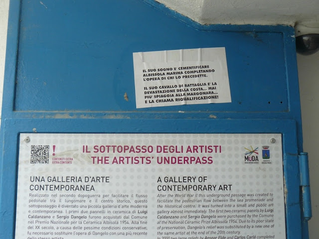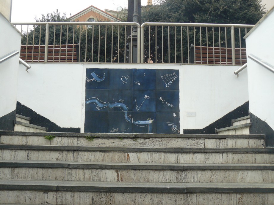 Anche il sottopasso degli artisti che collega il lungomare alla via principale interna della città (non un carruggio o, come si dice scorrettamente, budello, poiché abbastanza ampia e probabilmente più recente) è contraddistinto da opere d’arte, sempre in stile contemporaneistico. La cosa che sorprende è che nemmeno qui ci sono tracce di vandalismi, segno di una forte coesione sociale (o, anche, a essere pessimisti, di una età media più elevata, con meno ragazzini out of control: per quanto comitive di ragazzini locali si vedano in giro, ed evidentemente non vandalizzano). La fine di un sottopasso d’arte a Mondovì non sarebbe oggettivamente la stessa.