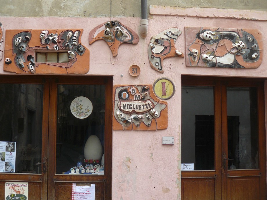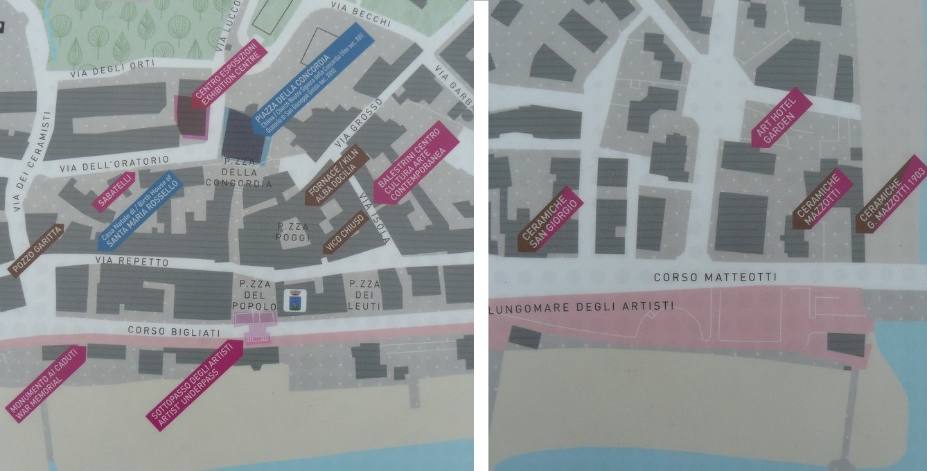 All’interessante lungomare si interfacciano poi le varie ditte di ceramica tuttora attive, di varie dimensioni e tipologie di produzione. La San Giorgio si affaccia proprio sul lungomare; vicino al Garden Hotel si trovano invece le due filiazioni della Mazzotti, una delle quali ha anche un vasto museo storico, che rivaleggia con quello – comunque di ottimo livello – posto a fianco della biblioteca civica, dove abbiamo anche potuto fare due parole con un attento, documentato e entusiasta volontario, che identificatici come turisti ha subito provveduto a schedarci (con garbo…) per il database civico, e ha dato alcune notazioni turistiche di opportunità di visita e dettagli curiosi. Le realtà più piccole – almeno sotto il profilo della dimensione espositiva – sono molto varie, e coprono un range che va dalla ceramica più tradizionale a gallerie d’arte decisamente aggiornate.