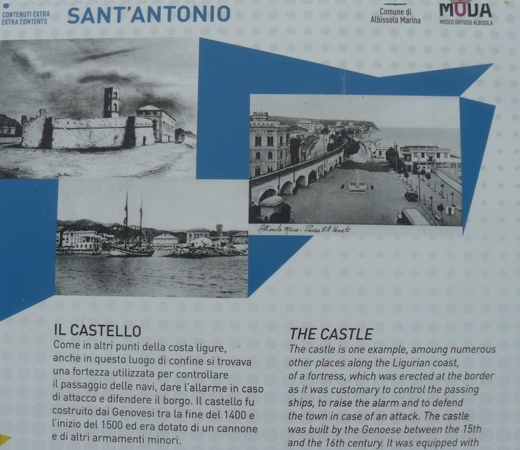 In prevalenza, le attrattive artistiche di Albisola sono più orientate al contemporaneo (e anche questa è una particolarità, in un tessuto europeo, e ancor più italiano, legato ad una lunga tradizione storica) ma non mancano nemmeno elementi tradizionali, come questo Castelletto quattrocentesco piuttosto tradizionale, oggi casa privata. Anche in questo caso, esaustiva scheda esplicativa evidenzia l’opera in modo sintetico e bilingue.